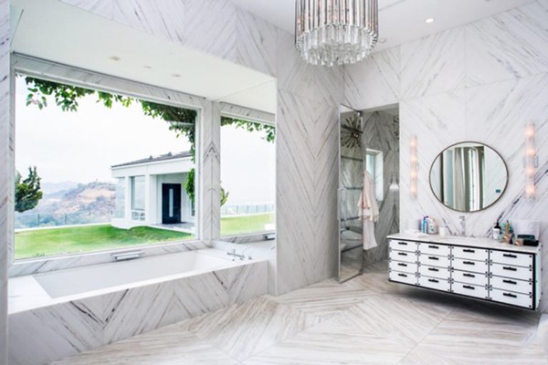 A vision in white, this amazingly luxurious bathroom is made entirely of marble! The bookmatched slabs really catch the eye. And did we mention the view? (Photo via Trulia.)