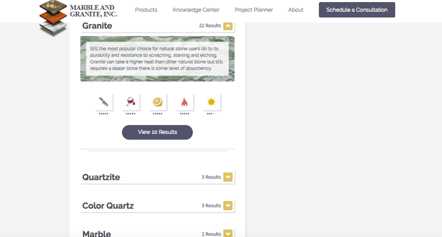 Project Planner. If you have an idea of what color you might want to incorporate into your project, simply select the one that appeals to you most. From here, the planner will walk you through the various stone types recommended in that color. You can expand each section to learn about the unique attributes associated with each material. Easy-to-read icons will also show you which materials offer scratch, stain, abrasion, heat, and UV resistance.