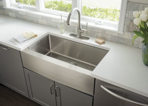 Continuing the trend of handmade products, handmade sinks are gaining in popularity. For example, the Premium Handmade Stainless Steel sink from Hardware Resources is made from flat, high-quality steel. They’re bent and welded into geometric shapes that make the best use of the sinks’ interior working space. Efficient, stylish, spacious, sleek, and sound proof, the sinks are specifically designed to give home chefs a professional-grade work environment. Reinforcement plates prevent bending and buckling and an added insulation layer further enhances durability while reducing sound when items are placed in the sink.